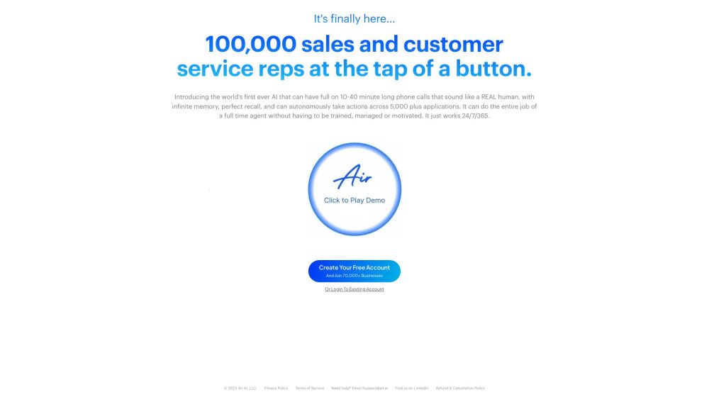 The ultimate AI assistant for sales and customer service, Air can have lifelike phone calls and autonomously handle tasks across multiple applications.