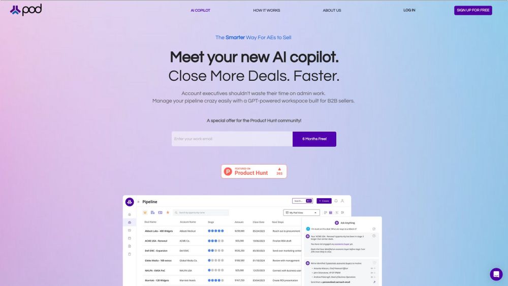 AI copilot Pod helps B2B salespeople close deals faster with streamlined pipeline management and AI-generated playbooks.