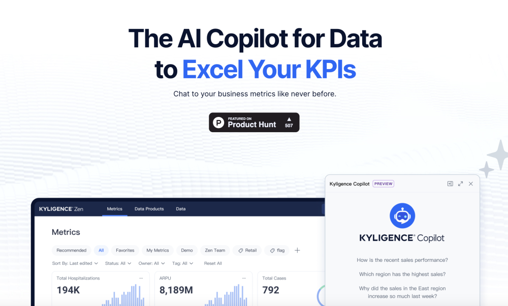 Kyligence Copilot: AI agent helping analyze KPIs, generating business summaries, and providing suggestions.