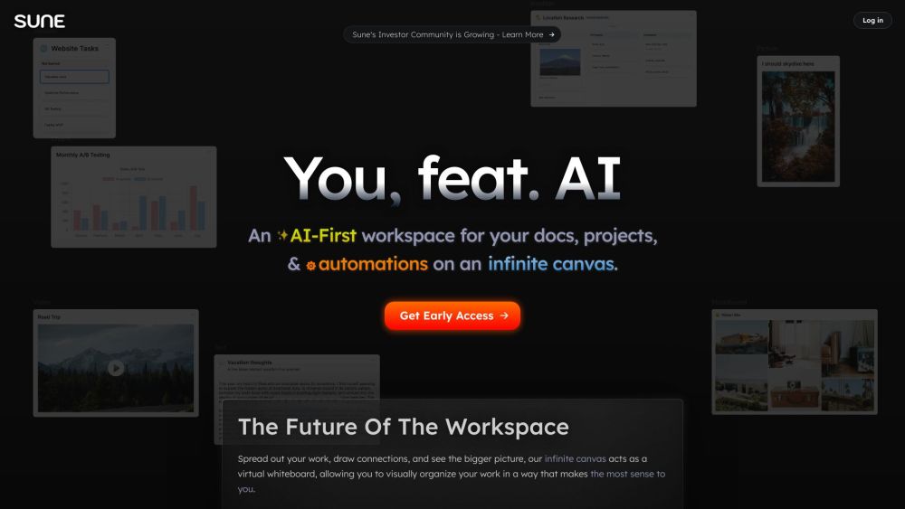 AI-first workspace Sune offers infinite canvas for visual organization and enhanced productivity.