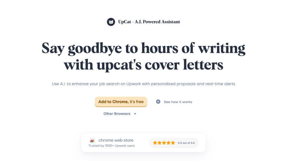UpCat is an AI assistant that improves job search on Upwork with personalized proposals and real-time alerts.