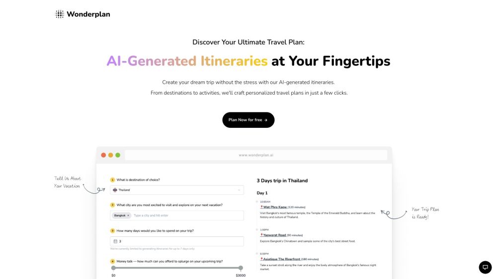 Wonderplan is an AI-powered trip planner that generates personalized travel recommendations based on your preferences and budget.