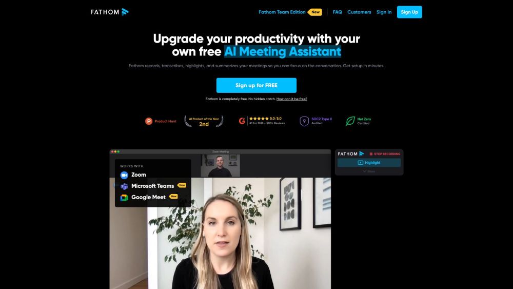 Fathom is a free AI Meeting Assistant that helps users focus on video calls without taking notes.